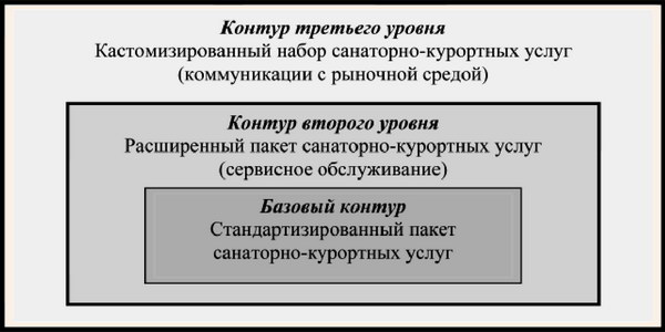 В даному випадку можна відзначити, що основна послуга (базовий контур) формує конкурентоспроможність санаторно-курортного підприємства, сервісне обслуговування (контур другого рівня - анімаційна та екскурсійна складові тощо) формує його конкурентоустойчивость, а комунікації з ринковою середовищем (контур третього рівня) - конкурентомобильность санаторно-курортного підприємства.