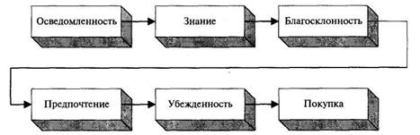 поінформованість, знання, прихильність, перевага, і покупка.