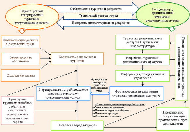 Визначальними факторами у формуванні туристично-рекреаційного продукту міста-курорту виступають в сукупності і функціональному взаємодії туристично-рекреаційні ресурси та туристично-рекреаційна інфраструктура. Характер взаємодії цих факторів в процесі формування туристсько-рекреаційного продукту забезпечується підприємствами, які працюють у сфері рекреації і туризму (рис. 2).