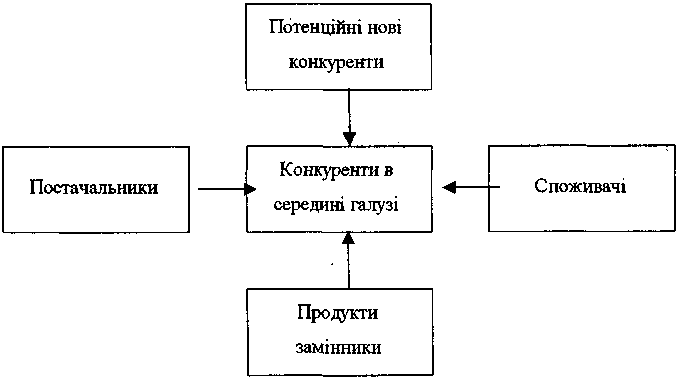 - конкуренцію з боку послуг, які є замінниками; - загрозу появи нових конкурентів; - позиції постачальників, їх економічні