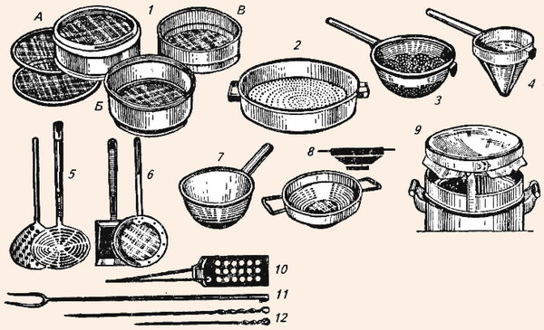 1 - сита; А - зі знімальними сітками і пластмасовою обичайкою; Б - з нержавіючої сіткою і алюмінієвої обичайкою; В - з волосяний сіткою і дерев'яною обичайкою; 2 - металевий гуркіт; 3 - металевий друшляк ємністю 7 л; 4 - конічне сито металеве; 5 - шумівки; 6 - ковші-сачки; 7 - черпак; 8 - цедилка металева; 9 - пристрій для проціджування бульйону; 10 - лопатка кухарська зі скидачем; 11 - вилка кухарська; 12 - шпажки для смаження шашликів