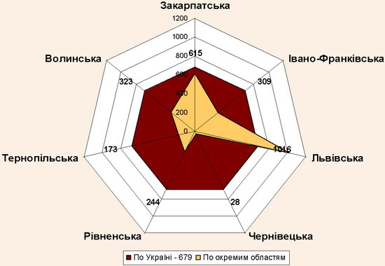 Кількість оздоровлених у санаторно-курортних та оздоровчих закладах по Західному регіону (на 10 тис населення; осіб) у 2009 р. подано на рис. 1.