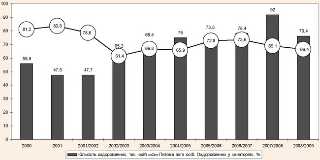 Отже, як видно з рис. 2, кількість санаторно-курортних та оздоровчих закладів починаючи з 2006/2007 років істотно скоротилася (з 69 одиниць в 2006/2007 рр. до 60 одиниць в 2008-2009 рр.), проте стабільно збільшується питома вага в наявних закладах.